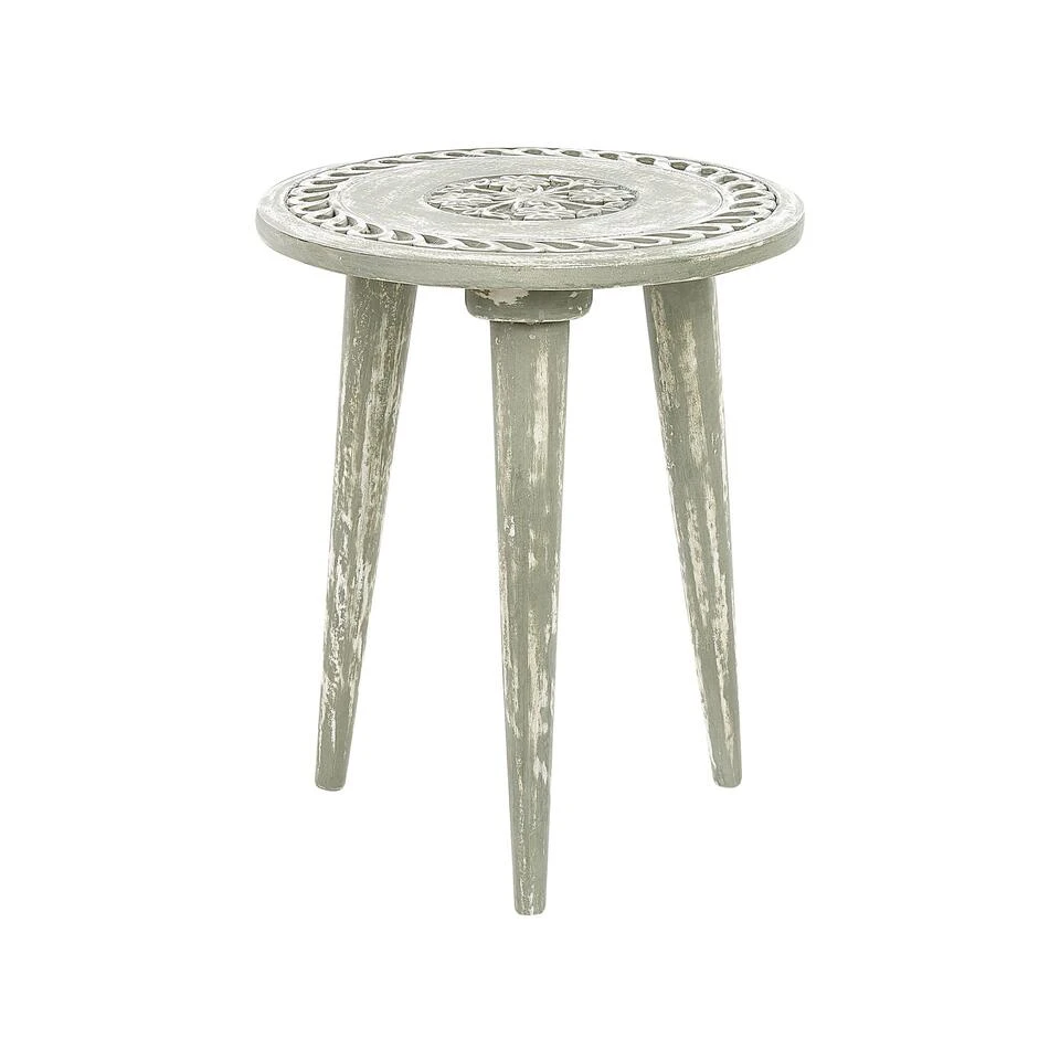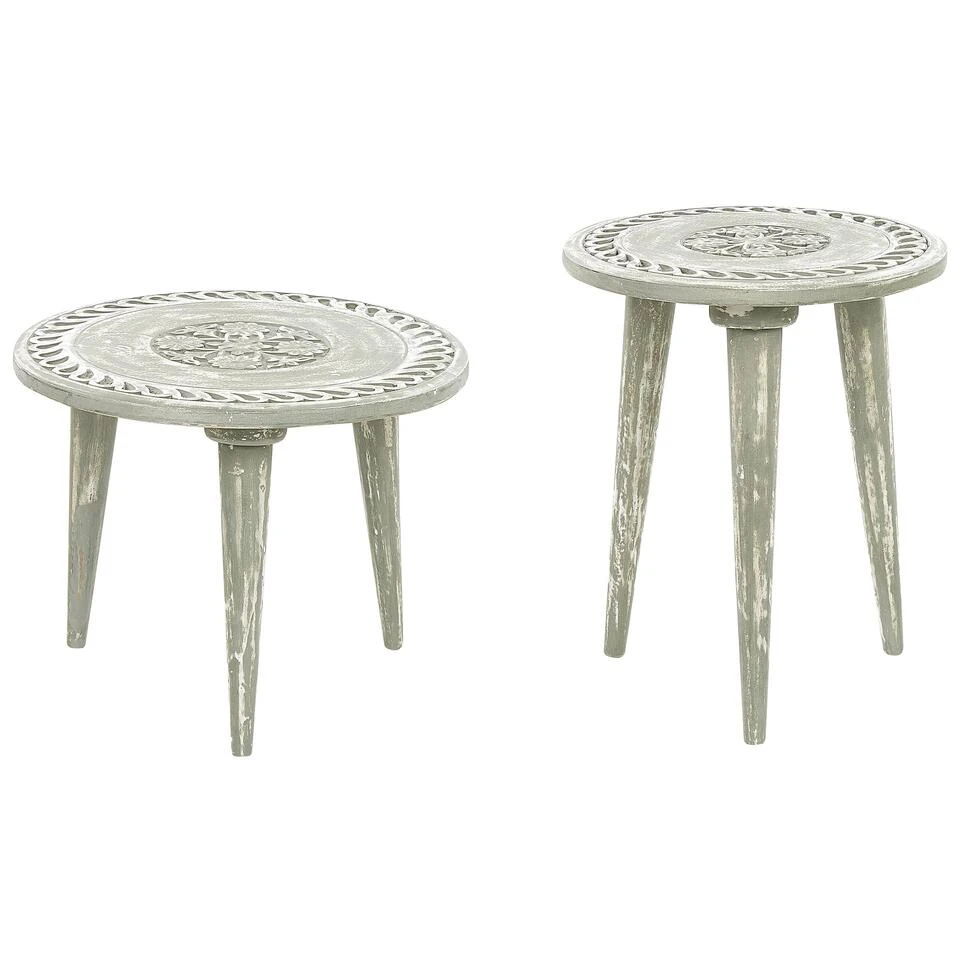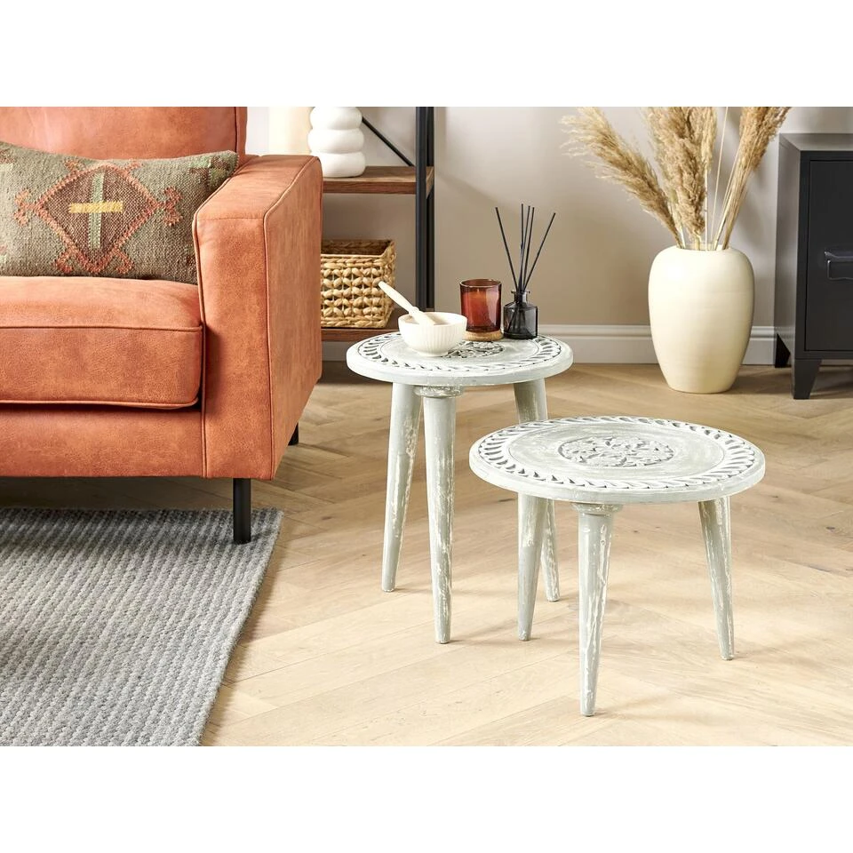 Handgemaakte tafels met versierd blad. Breng een vintage look in je interieur met deze stijlvolle set bijzettafels. Beide stukken zijn gemaakt van massief mangohout en zijn stabiel en duurzaam, en ze kunnen vele jaren meegaan, zelfs zonder dagelijks onderhoud. Hun groene kleur is licht verweerd en omdat elk stuk handgemaakt is, zal geen enkele tafel hetzelfde zijn. Op hun tafelblad hebben ze siersnijwerk, wat hun retro-look versterkt.