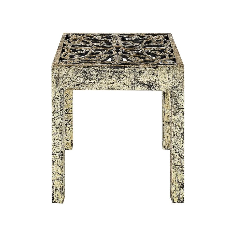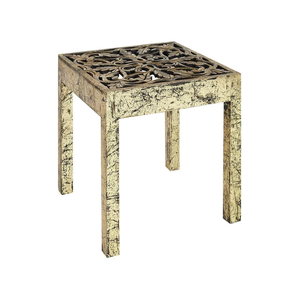 Verweerde tafel in Oosterse stijl. Voeg een vleugje vintage toe aan je interieur met deze zeer decoratieve maar functionele bijzettafel. De goudkleurige afwerking met zichtbare slijtplekken, wat een verweerd effect geeft, past mooi bij het uitgesneden blad. Het product is perfect als salontafel voor de woonkamer of als standaard voor kleine accessoires, of als pot met je favoriete plant.