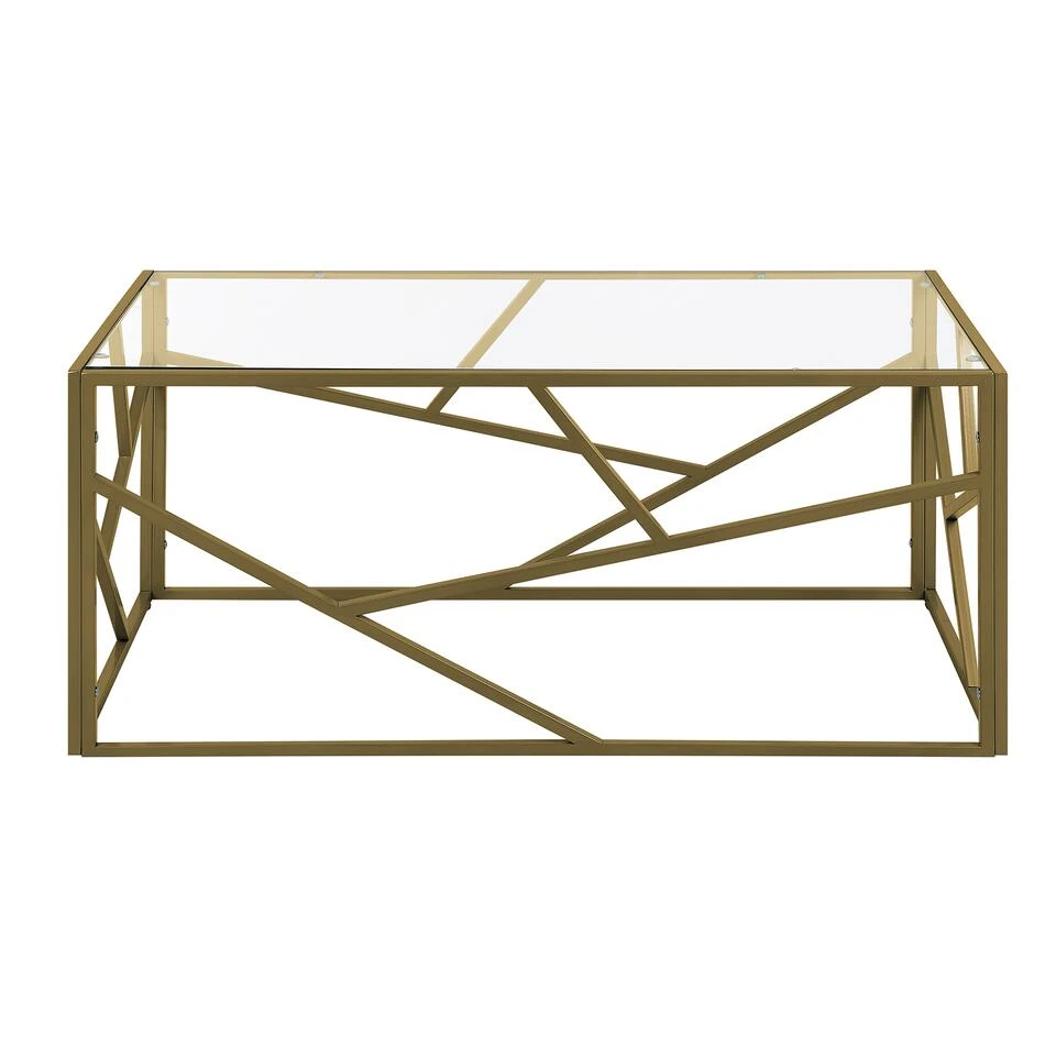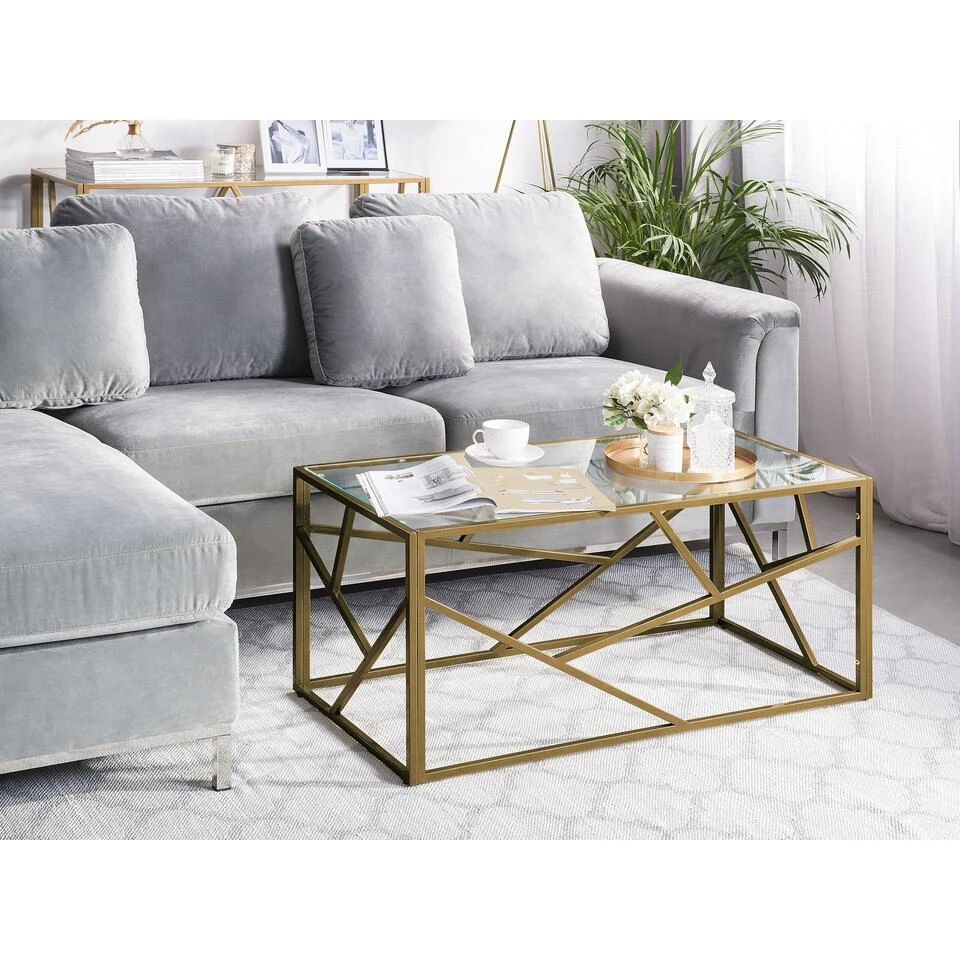 Stijlvolle salontafel in goud. Deze nobele salontafel in een modern design laat de woonkamer stralen in een heel nieuw licht. Het goudkleurige, rechthoekige frame heeft extra stutten aan de zijkanten, die niet alleen een decoratief accent toevoegen, maar ook de hele constructie van de tafel stabiliseren. Het tafelblad van glas geeft het meubel ook een optische lichtheid.