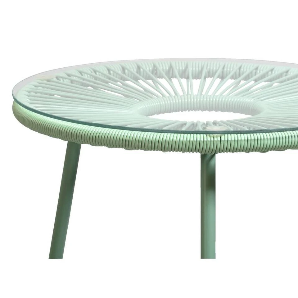 Dit ronde bijzettafeltje is gemaakt van metaal en kunststof. Het heeft een glazen blad, waardoor je veilig je lekkerste drankjes erop kunt zetten. Door dit onderhoudsvrije materiaal is dit bijzettafeltje geschikt voor zowel binnen als buitengebruik. De lichtgroene kleur is de trendkleur van dit seizoen en zorgt voor kleur en warmte in je interieur. Het tafeltje is compact en handzaam, waardoor je het makkelijk kunt verplaatsen.