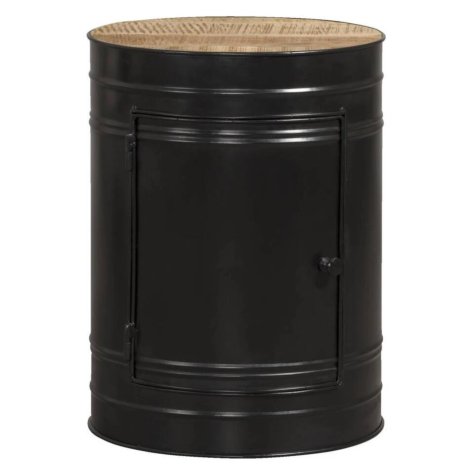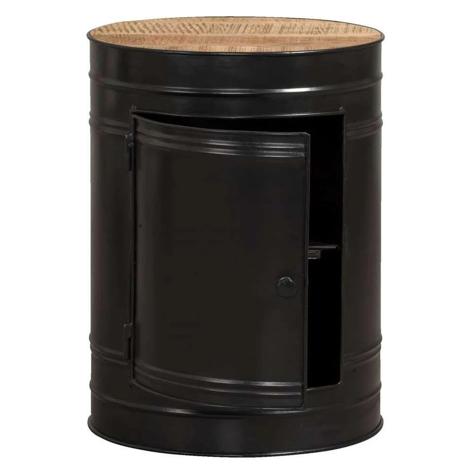 Bijzettafel Liam is een stoer tafeltje gemaakt van zwart metaal met een houten blad. In het tafeltje zit een deurtje met daar achter opbergruimte. Dat is handig, zo kun je losse spullen netjes uit het zicht opbergen. Ideaal voor bijvoorbeeld oplaadsnoertjes.