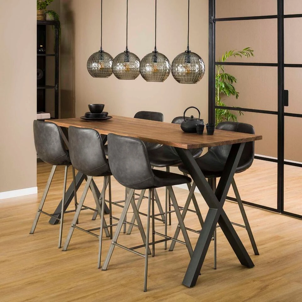 Wilt u wonen volgens de laatste trends? Dan is bartafel Dimitry uit de collectie van het woonmerk Fraaai een perfecte keuze! Deze stoere en trendy tafel is voorzien van een tafelblad in Saja naturel notenhout met een mooie dikte van 30 mm. Dit tafelblad heeft een prachtige en unieke houtstructuur en bevat verschillende kleurschakeringen, waardoor elke tafel zijn eigen karakter heeft. Onder het tafelblad bevinden zich twee metalen X-poten met een donkergrijze poedercoating als afwerking. De poten kunnen op twee verschillende plaatsen onder de tafel worden gemonteerd (zie foto’s). Plaats deze gave bartafel Dimitry in de eetkamer of woonkeuken en geniet van gezellige etentjes aan deze mooie eyecatcher. Deze bartafel is onderdeel van de Dimitry-serie.