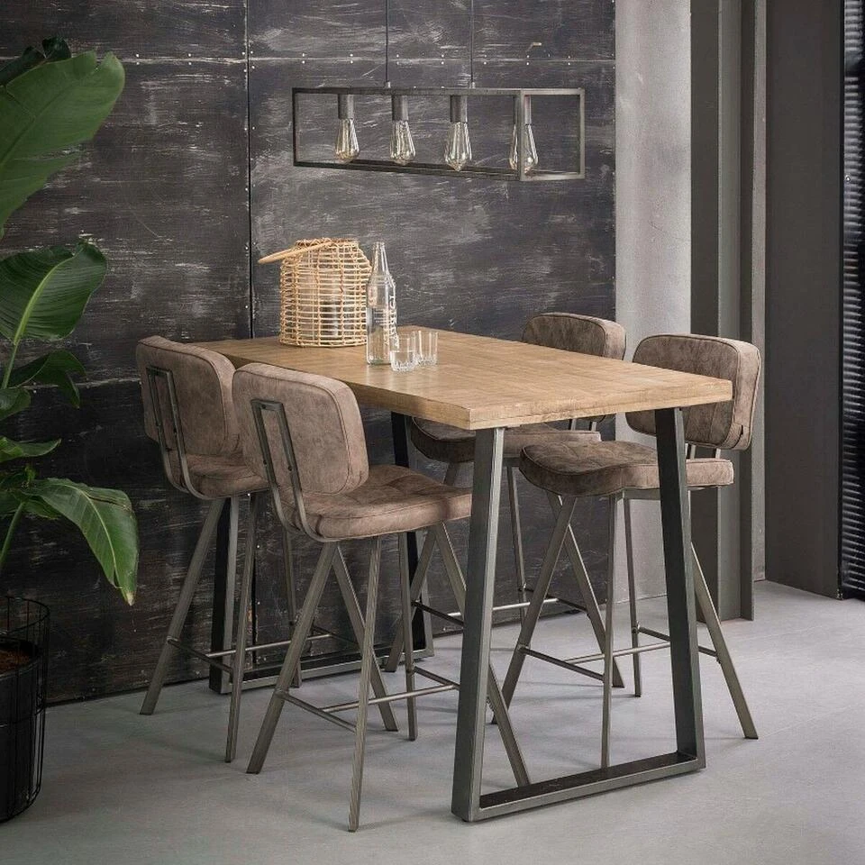 Deze moderne Holly bartafel past perfect in een strak of industrieel interieur en heeft een tafelblad met een afmeting van 135×70 cm. Het tafelblad is gemaakt van massief mangohout en is blank afgelakt. Dit blad rust op twee stevige geschuurde stalen poten, welke een mooie trapezevorm hebben. Deze bartafel is ook verkrijgbaar met een leemkleurig mangohouten tafelblad. Tevens zijn er eettafels verkrijgbaar binnen dezelfde serie!