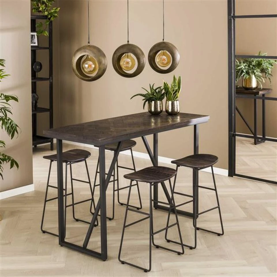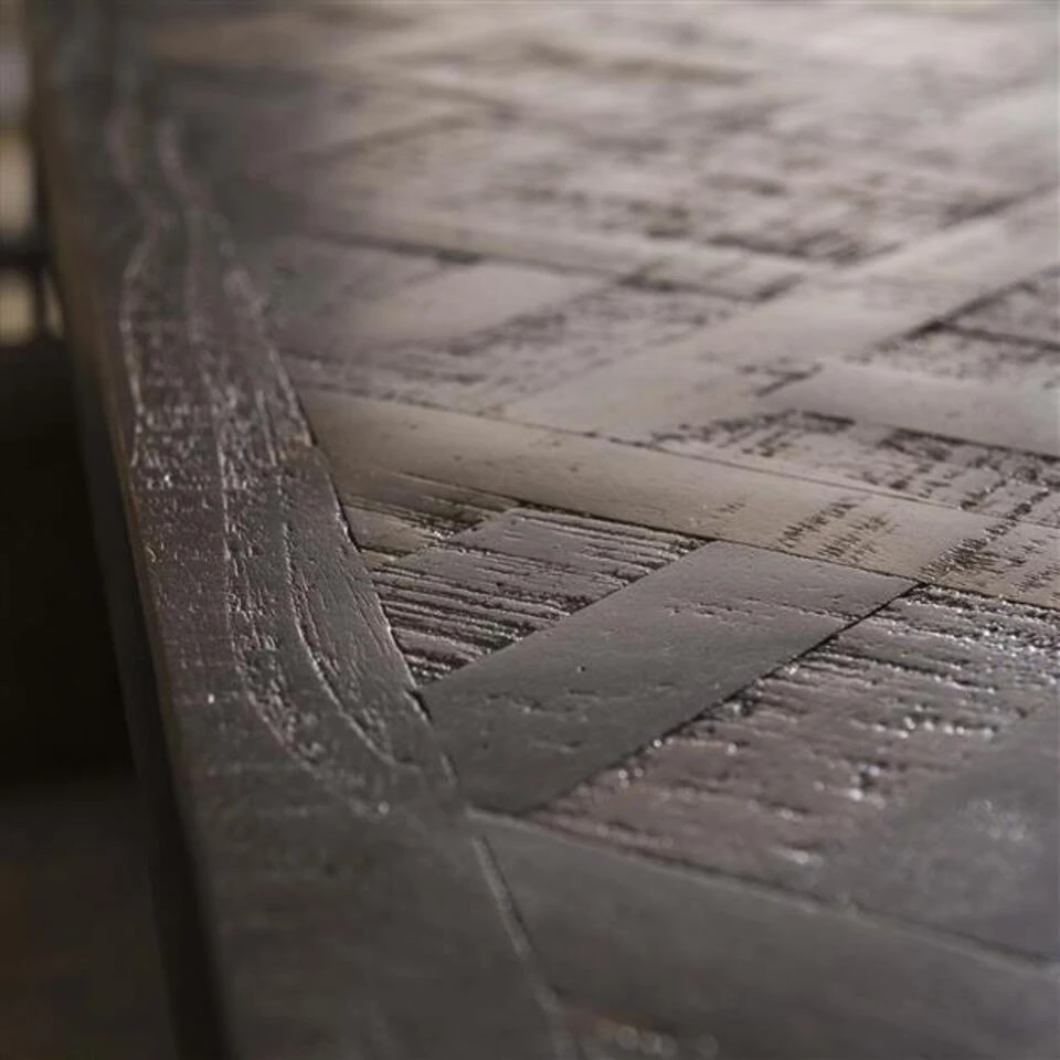 Deze trendy bartafel ‘Vine’ is uitgevoerd in teakhout. Het tafelblad is ingelegd met een ‘versailles’ houtpatroon wat lijkt op visgraat en dit zorgt voor een prachtige uitstraling. De tafel heeft bijpassende barstoelen, waarvan er twee aan elke kant geplaatst kunnen worden. Daarnaast kan er natuurlijk altijd voor een andere barstoel gekozen worden. Deze bartafel maakt deel uit van de ‘Vine’ serie.