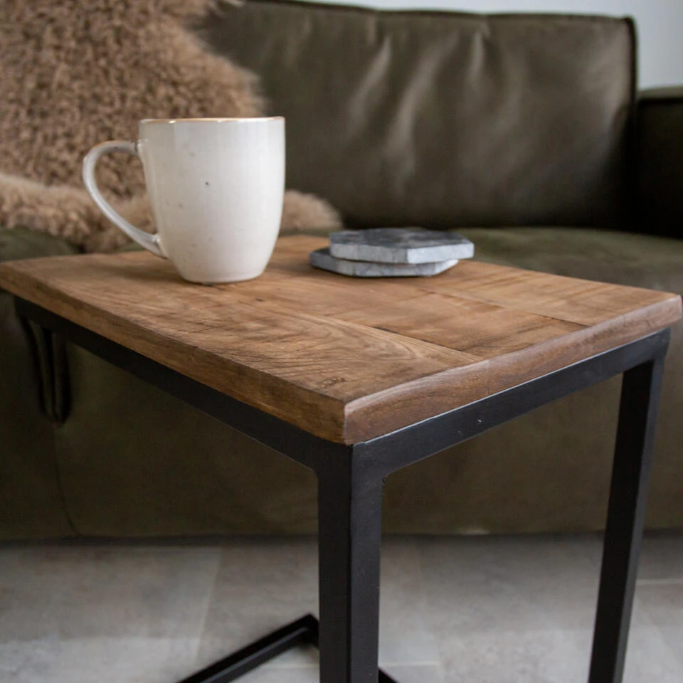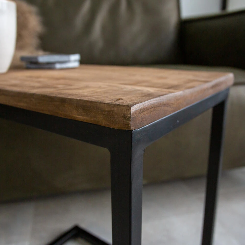 De zuil is voorzien van een massief mangohouten blad. Het mangohout heeft een lichte basiskleur en kenmerkt zich door ruige en donkere accenten. Enerzijds past het perfect in de huidige industriële interieurs, anderzijds heeft mango een behoorlijk koloniale uitstraling. Materiaal frame
