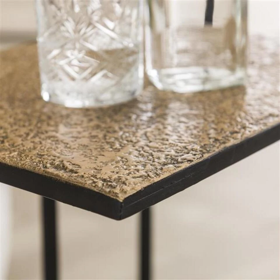 Het blad van de laptoptafel Lizzy is gemaakt van gepoedercoat metaal en is afgewerkt met een bronze metallic finish. Het blad is niet helemaal egaal en beschikt over een vintage look.