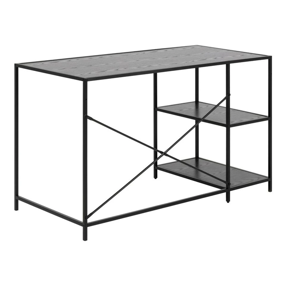 Verhoog je productiviteit aan dit stijlvolle bureau met veel opbergruimte. De combinatie van de zwarte essenhouten look en het zwarte metaal zorgen voor een consistent designstuk. Dit bureau maakt een kamer stijlvol af en is gemaakt om te passen bij vele stijlen van inrichting. Het heeft 2 ruime planken – perfect voor het opbergen van je kantoorbenodigdheden.