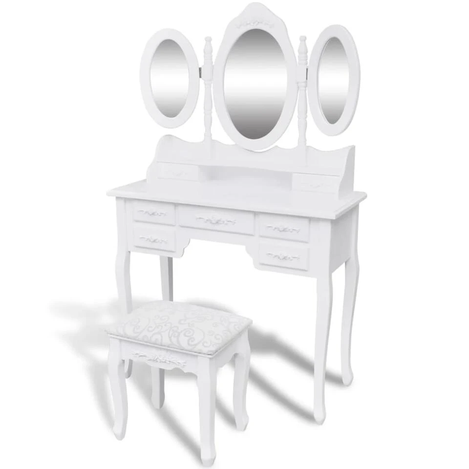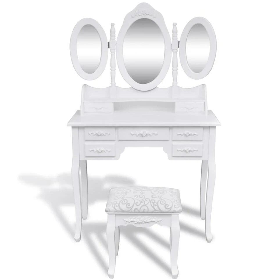 Het goede vakmanschap draagt ook bij aan de uitstraling van deze tafel met kruk. De spiegels hebben een vrijstaand frame, en je kan de 2 zijspiegels naar de gewenste hoek draaien. De tafel en het spiegelframe kunnen los van elkaar worden gebruikt. De 5 mooie lades bieden extra ruimte voor je sieraden, make-up en andere spulletjes. De kaptafel met kruk wordt een blikvanger in iedere kamer.