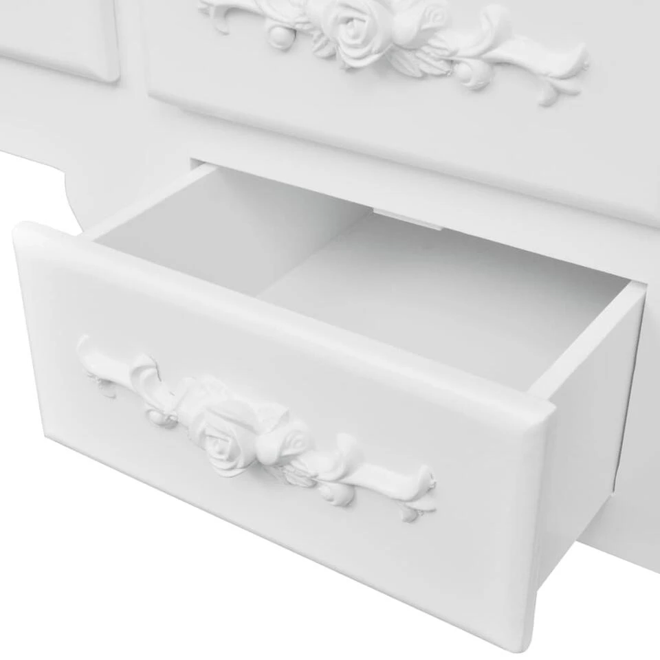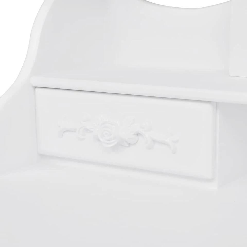 Deze mooie kaptafel met kruk is gemaakt van hoogwaardig hout. De Victoriaanse stijl en de mooie witte afwerking geven een vleugje elegantie en schoonheid aan je slaapkamer.