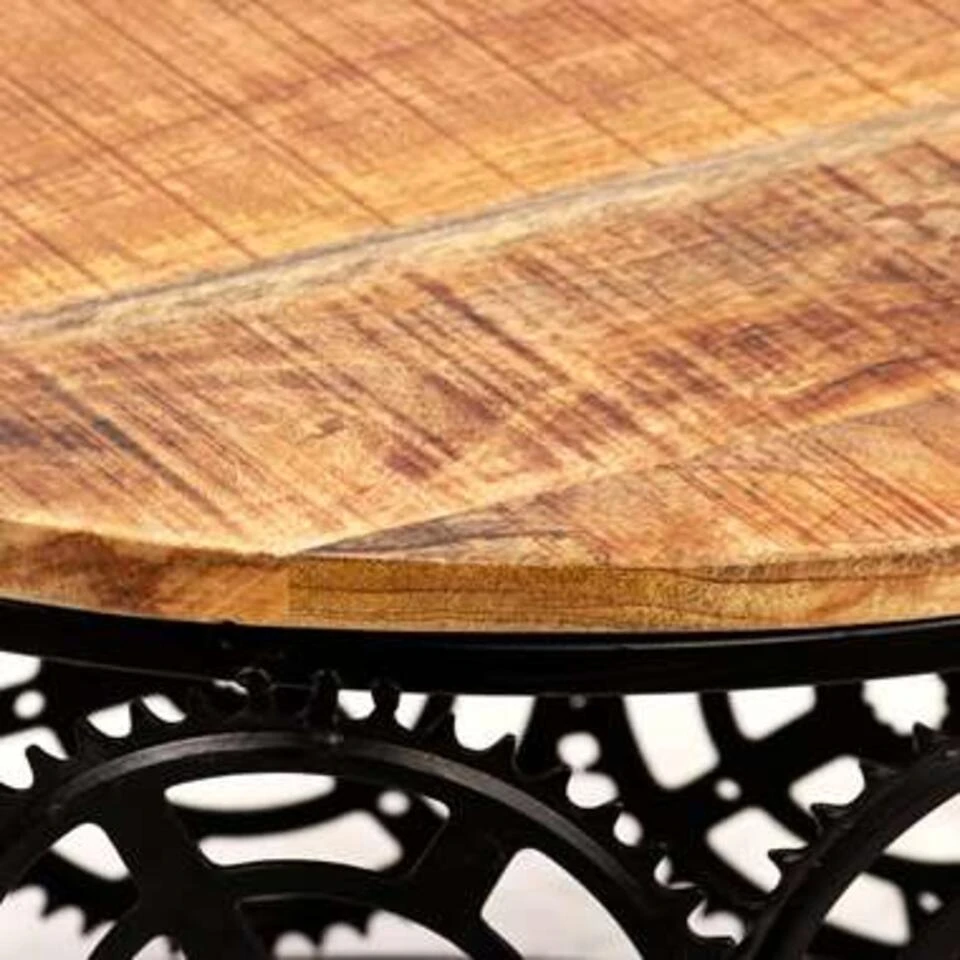 De tafel is handgemaakt van massief mangohout, dat massief, stabiel, duurzaam en mooi is. Het vakmanschap draagt bij aan de spectaculaire retro stijl. Elke stap van het proces wordt met de grootste zorg uitgevoerd, of het nu gaat om polijsten of lakken. Het vakmanschap en de mooie houtnerven maken elk meubel uniek en enigszins anders dan de rest. De basis van de tafel is gemaakt van hergebruikte fietstandwielen om hem die authentieke retro-industriële sfeer te geven. Het product is al gemonteerd; er is geen montage vereist.