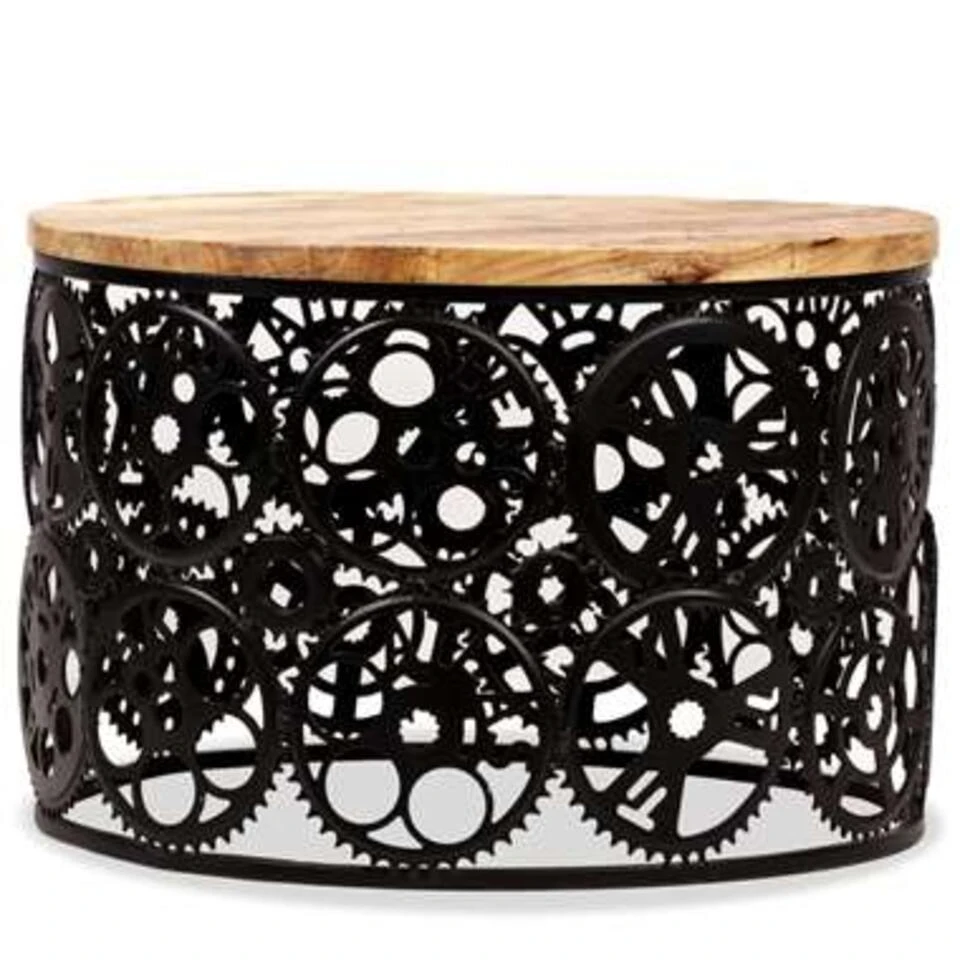 Deze houten salontafel in de trendy steampunk stijl ademt industriële charme uit en is een tijdloze toevoeging aan je kamer.